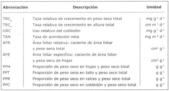 El Área Foliar Relativa (AFR) puede ser dividida también en dos componentes: el Área Foliar Especifica (AFE, el área foliar por gramo de peso seco de las hojas), y la Proporción de Peso en Hojas (PPH, la proporción que tienen las hojas en el peso seco total de la planta). El AFE está relacionado con el grosor de las hojas, y el PPH con la "inversión" de biomasa en el componente de las hojas. Aparte de los parámetros morfológicos mencionados, calculamos también las proporciones de biomasa del tallo (PPT), raíces (PPR) y cotiledón (PPC). El peso del cotiledón fue excluido del peso seco de la planta para el cálculo de AFR y las proporciones de biomasa PPH, PPT y PPR, por el hecho que la proporción de peso en el cotiledón fue alta y el cotiledón tiene la función de proveedor así como la de consumidor de carbohidratos. En la Tabla 2 resumimos los diferentes parámetros del análisis de crecimiento.