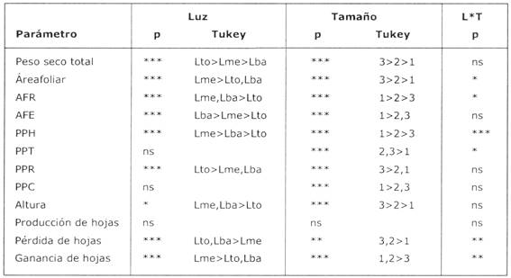Tabla 3: Resultado de un Análisis de Varianza de dos factores (* = P < 0,05; ** = P < 0,01; *** = P < 0,001; ns = no significativo) y una prueba de Tukey HSD (con P < 0,05) para parámetros medidos en plantines de B. excelsa de tres diferentes categorías de tamaño (1, 2 y 3) crecido en tres diferentes condiciones de luz (Lto, Lme, Lba). En la columna L * T se presenta la significancia de la interacción de los factores luz y tamaño. Para la descripción de los parámetros abreviados, vea Tabla 2.