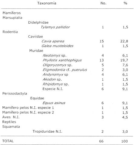 De las 14 especies de mamíferos, la gran mayoría fueron roedores Muridae, con el 59 % del total; 7 especies (30 ejemplares) de Muridae fueron identificados por lo menos a nivel de género, mientras que 6 ejemplares no pudieron ser clasificados, debido a que no encontramos ninguna muela (solamente pelos o mandíbulas incompletas) en las heces que ayude a la identificación. Los roedores Caviidae están en segundo lugar de preferencia de consumo con el 26,2 % del total de mamíferos; además encontramos pelos que no pudieron ser identificados y que tenían un tamaño considerable (2-3 cm), lo cual hace suponer que se trata de un mamífero mediano o grande (Ver tabla 2).