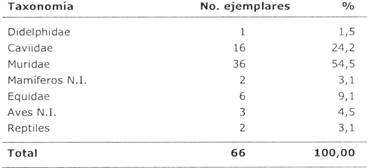 De las 16 especies -66 ejemplares- encontradas en total, 14 especies -61 ejemplares- (92,42 %) fueron mamíferos, 1 especies -3 ejemplares- (4,54 %) fueron aves y 1 especie -2 ejemplares (2,04 %) fueron reptiles.