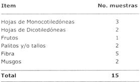 Quince de las 35 muestras contenían restos vegetales, pero tan sólo una contenía frutos con cantidad suficiente como para suponer que fueron consumidos intencionalmente. Sin embargo muchos carnívoros consumen pequeñas cantidades de vegetales como suplemento de minerales para su dieta (A. Taber com. pers.) (Ver tabla 3).