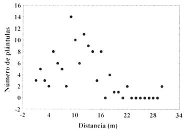 La abundancia de las plántulas disminuye con la distancia al árbol parental (n = 30; rs =-0,67; P = 0,001)(Fig. 1), por lo tanto, la densidad de las plántulas podría responder a un efecto de distancia y se relacionaría con la influencia que tiene el viento en los procesos de dispersión de las semillas.