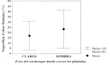 Los niveles de herbivoría que se encontraron en este estudio (Fig. 2) son superiores a los encontrados por Watkins & Gullison en el Bosque Tsimane (7,8% para claros del bosque y 1,9% para sitios con sombra). Los resultados de este estudio no mantienen la tendencia de una mayor susceptibilidad al daño foliar en plántulas que se establecen en los claros del bosque con relación a las que crecen en zonas con sombra, no obstante se esperaría que el crecimiento de las plántulas de los claros supere ampliamente al crecimiento de las plántulas que se establecen en zonas densas del sotobosque (Gullison et al. 1996).