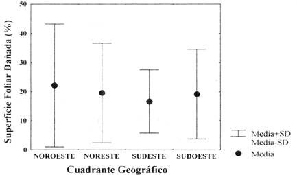 Fig. 3: Diferencia de la superficie foliar dañada (%SFD) por cuadrante geográfico con relación al árbol parental (H[3] = 0,13; P>0,05)