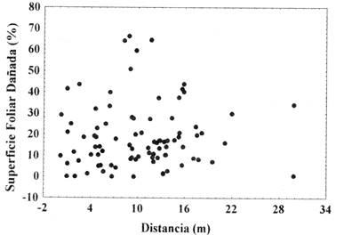 Fig. 4: Relación entre la superficie foliar dañada (%) y la distancia de las plántulas al árbol parental (n = 113; r =0,07; P>0,05)
