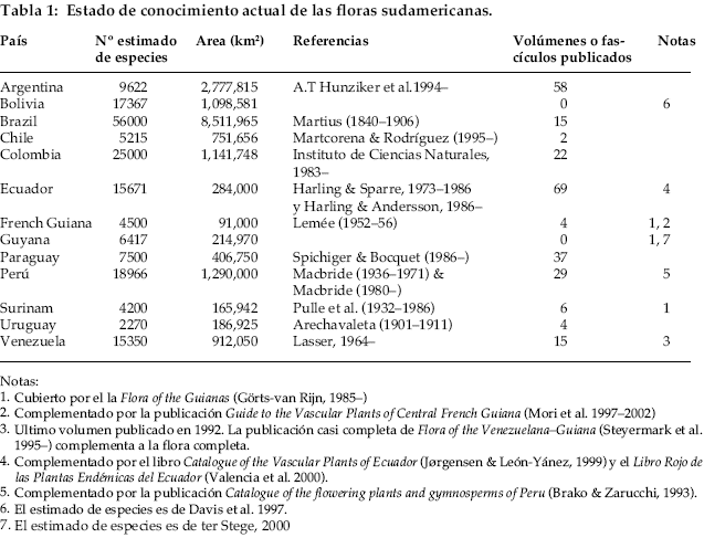 Cuando von Martius (1840–1906) comenzó su trabajo sobre la flora de Brasil se trataba de un trabajo monumental. Sin embargo, finalizó el proyecto cubriendo casi todas las familias y cerca a 22.000 especies (menos de la mitad de lo que ha sido estimado para Brasil hoy en día). Según la tabla 1, la flora de Surinam de Pulle (1932–1986) fue la siguiente flora de un país sudamericano, pero todavía permanece incompleta. La Flora de Perú (Macbride 1936–1971, 1980–) está también incompleta, y numerosas correcciones son necesarias para actualizar los primeros volúmenes como se ve claramente en Brako & Zarucchi (1993). Lemée (1952–56) produjo la Flora de la Guiana Francesa que podría considerarse completa, pero cubre sólo las áreas más cercanas a la costa y ahora ha sido complementada por Mori et al. (1997–2002). En Uruguay se tuvo un proyecto de flora que fue elaborado de 1958 a 1972 en el Museo Nacional de Historia Natural, pero produjo sólo 4 fascículos. Lasser (1964–) en la Flora de Venezuela fue complementado por la Flora de Venezuela Guyana (Steyermark et al. 1995–), completa e ilustrada. Todavía están en camino las floras de Ecuador (Harling & Sparre, 1973–1986 y Harling & Andersson, 1986–), Colombia (varios editores, 1983–), Paraguay (Spichiger & Bocquet 1983–), Argentina (Hunziker et al., 1994–) y Chile (Marticorena & Rodríguez, 1995–).