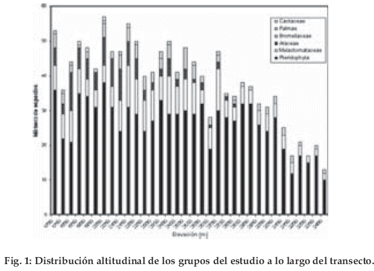 En el año 2000 se realizaron 65 relevamientos fitosociológicos, en base a los grupos indicadores con más de 2.400 registros. Encontramos estos grupos de plantas frecuentemente a lo largo del transecto y solamente las cactáceas fueron una excepción (Fig. 1). El porcentaje de las colecciones identificadas hasta julio 2001 alcanza el 75%, lo cual podría ascender hasta 88%, si descontamos a las Melastomataceae (Fig. 2). Considerando el número total de especies, el grupo más importante corresponde a las pteridófitas (70.5%), seguido por las melastomatáceas (14.5%), aráceas (7.6%) y las bromeliáceas (5.5%). La clasificación preliminar de la vegetación en el área de estudio muestra cuatro tipos diferentes de bosques: Bosque montano (hasta 2.100 m), bosque altimontano I (2.100-2.600 m, bosque altimontano II (2.600 –3.150 m) y el bosque tropical subalpino (3.150-3.400 m), los cuales son caracterizados a continuación.