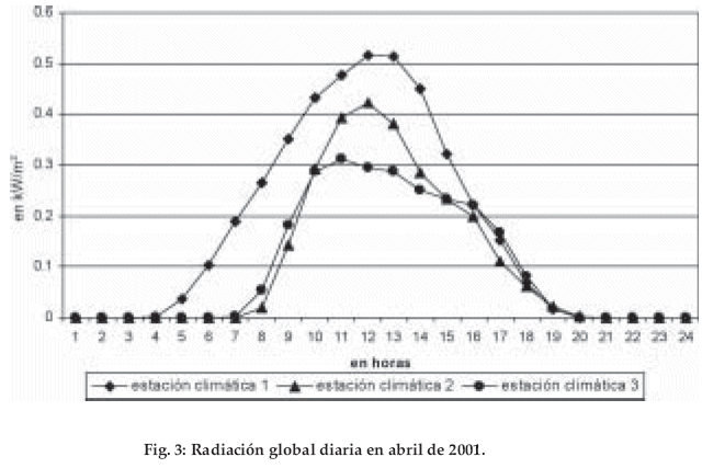 Las amplitudes de las sumas de los valores diarios se ven evidentemente influenciadas por el cambio hipsométrico y por los cambios en la nubosidad, las diferencias entre un día soleado y un día nublado. Cuando en la estación 1 hay una diferencia de 3 ó hasta 4 veces entre un día soleado y un día nublado, en la estación 3 la más alta, muestra solamente una diferencia de hasta 1.5 veces.