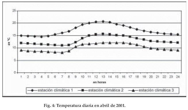 La radiación global, un factor importante para la determinación de la evapotranspiración, disminuye con la altitud. El mes de abril de 2001 es un ejemplo representativo de esta relación: a la altitud de 1.820 m, la mayor radiación global registrada presenta un máximo 0.5 kW/m2, a los 2.550 m un 0.4 kW/m2 y a los 3.010 m un máximo de 0.3 kW/m2 (Fig. 3). La disminución de la radiación ocurre debido al aumento de la nubosidad con el incremento de la altitud. Con la temperatura del aire se observa también un gradiente evidente. El promedio de la temperatura mensual en la estación 1 a los 1.820 m es de 17.2°C, en la siguiente estación 2 a los 2.550 m con 13.0°C y en la estación 3 a 3.010 m con 10.1°C. La amplitud diaria corresponde al orden de la temperatura media: Bosque altimontano I 6.1°C, bosque altimontano II 4.0°C, bosque tropical subalpino 4.0°C (Fig. 4, tabla 1). El gradiente de las temperaturas promedio (registradas por las estaciones climáticas) es de 0.63°C por cada 100 m de diferencia de altitud. Comparativamente, los mismos registros hechos en la vegetación a la altura de 2 m sobre el nivel del suelo, muestran una disminución de la temperatura en 0.51°C, debido a la mayor humedad presente en la vegetación.