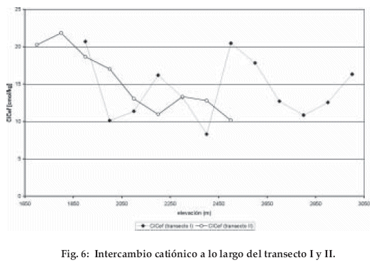 Hasta el bosque altimontano II, las bases intercambiables se concentran en la materia orgánica. A diferencia de las cordilleras de Venezuela (Hetsch 1976), Colombia (Hetsch & Folster 1979, van der Hammen & Ruiz 1984) y Ecuador (Schrumpf et al. 2001), los parámetros del suelo no tienen ningún gradiente vertical significativo (Fig 6). La estructura de los perfiles se diferencia por el relieve (inclinación, microrelieve con diferente drenaje de suelo), por la influencia de la composición de la vegetación, por la calidad y cantidad de materia orgánica y la edad de los suelos. Estas características también permiten diferenciar los tipos de suelo de bosques montanos de la zona alta.