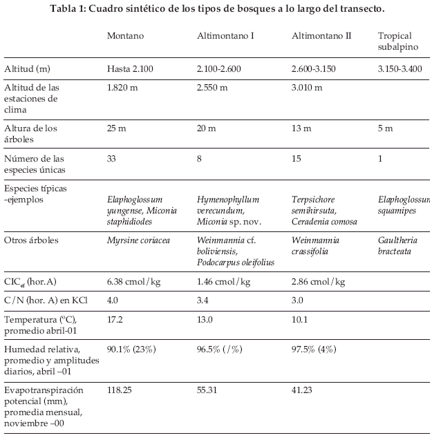 Los límites de bosque encontrados en el presente trabajo son parecidos a los resultados obtenidos por Gradstein & Frahm (1987) en el norte del Perú, en la Cordillera oriental de los Andes. Estos tipos de vegetación corresponden al „bosque húmedo montañoso de Yungas“ (700m), al „bosque nublado de ceja“ (2.000–3600m) y al ecotono arbustivo-arbóreo de la „pradera parámica húmeda de alta montaña“ (Ribera 1992).