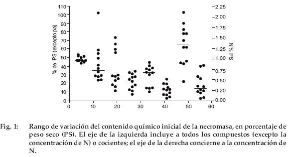 La base de datos cubrió un amplio rango de variación de calidad de hojarasca, incluyendo arbustos perennes, una dicotiledónea herbácea y gramíneas con sus diferentes órganos: hojas o partes aéreas, tallos y raíces. Los arbustos y la dicotiledónea herbácea mostraron un elevado contenido en N y un bajo contenido en LIG, los partes aéreas de gramíneas un bajo contenido en NS y LIG, mientras que las raíces un elevado contenido en LIG. Los cocientes C/N y LIG/N – que a menudo son considerados buenos predictores de la tasa de descomposición (Aber & Melillo 1982, Pérez-Harguindeguy et al. 2000) – cubrieron un rango homogéneo de 22-103 y 3-41, respectivamente. Por el contrario, el rango de variación de N, NS y CEL fue discontinuo. La especie que se diferenció netamente de las demás fue Erodium cicutarium, con un muy alto contenido en N (2.1%) y que mostró la descomposición más rápida, después de las hojas de Baccharis incarum. Sin embargo, el contenido de N por sí solo no se correlacionó significativamente con la tasa de descomposición. NS y CEL diferenciaron a arbustos y a la dicotiledónea herbácea de las gramíneas y raíces. En este caso, la proporción C/N fue un mejor predictor que LIG/N. En un desierto de Norteamérica, Schaefer et al. (1985) también mostraron que LIG/N fue un mal predictor de la descomposición.