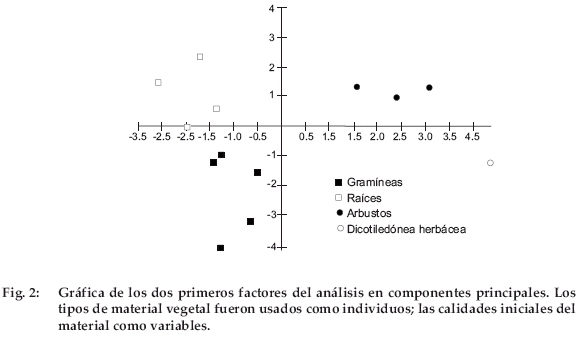 La concentración de N osciló entre 0.50 y 2.1%, siendo los valores más bajos en raíces y gramíneas, y el más elevado para Erodium cicutarium, muy superior al siguiente de 1.21% para las hojas de Baccharis incarum. Las concentraciones de NS fueron de 16-74%; los valores más bajos se dieron en gramíneas y el más alto, nuevamente para Erodium cicutarium. Se pueden distinguir dos grupos: (i) Erodium cicutarium, hojas y tallos de Baccharis incarum y tallos de Parastrephia lepidophylla con una concentración de NS más elevada que el 50% y (ii) el resto del material vegetal con una concentración de NS inferior al 50%. Las concentraciones de HEM fluctuaron entre 7 y 34%, el valor más bajo correspondió a Erodium cicutarium y el mayor para las gramíneas. Las concentraciones de CEL oscilaron entre 10 y 45%, los valores menores para hojas y tallos de especies arbustivas y para Erodium cicutarium, mientras que los mayores correspondieron a las gramíneas. Se observó una baja concentración de CEL (inferior al 20%) para Erodium cicutarium, hojas y tallos de Baccharis incarum y tallos de Parastrephia lepidophylla, mientras que la concentración de CEL fue mayor para las demás especies. Es notable observar que el grupo con baja concentración de CEL coincide con el grupo con alta concentración de NS. Las concentraciones de LIG fueron de 3-25%. Los valores C/N fluctuaron homogéneamente entre 22 y 103, y los valores LIG/N entre 3 y 41. Se realizó un análisis de componentes principales tomando los tipos de material vegetal como individuos y los componentes químicas de la hojarasca como variables. En una gráfica donde el primer y segundo factores explicaron el 88% de la varianza, el material vegetal quedó distribuido en tres grupos: hojas de arbustos y Erodium cicutarium, partes aéreas de gramíneas y las raíces de todas las plantas (Fig. 2). El primer eje se relaciona con los contenidos de N, NS, HEM y CEL, mientras que el segundo eje se relaciona con los contenidos en C y LIG. Se observó una correlación positiva y significativa entre N y NS (R=0.767) y negativa de N con HEM (R=0.642) y CEL (R=-0.633). La correlación entre N y LIG no fue significativa.