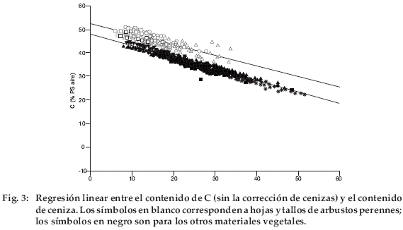 La gráfica del contenido de C (sin la corrección de cenizas) frente al contenido de cenizas (Fig. 3) muestra dos grupos bien diferenciados: un primer grupo, con hojas y tallos de Baccharis incarumy tallos deParastrephia lepidophylla, y un segundo grupo con todas las demás especies. El primer grupo fue identificado ya por su elevado contenido inicial de C (con la corrección de cenizas). Las pendientes de ambos grupos no son significativamente diferentes. El ajuste fue mejor para el segundo grupo (R2=0.95) que para el primero (R2=0.74).