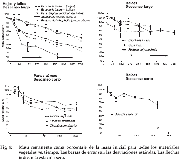 En descanso largo, la incubación duró unos dos años. Las hojas de Baccharis incarum fueron las más rápidas en descomponerse y perdieron el 60% de su masa durante los primeros tres meses (Fig. 4). La estación seca que siguió fue una fase de estabilización, seguida por una nueva fase de descomposición con el retorno de las lluvias. Después de 460 días de incubación, la masa remanente era sólo el 20% de la inicial. Los tallos de Baccharis incarum y Parastrephia lepidophyllase descompusieron más lentamente. Durante la primera época de lluvias, se perdió cerca del 40% de la masa inicial. Posteriormente, no se detectaron efectos estacionales. La masa remanente declinó linealmente hasta fines del segundo año. Stipa ichu y Festuca dolichophylla fueron las especies que se descompusieron más lentamente. Sus masas remanentes disminuyeron linealmente hasta el 60% después de dos años sin ningún aparente efecto estacional. Pese a que fueron enterradas, las raíces se descompusieron menos que la hojarasca por encima del suelo. Las raíces de Baccharis incarum fueron las más rápidas en descomponerse, con una pérdida de masa del 35% durante la primera estación lluviosa. Después, la masa remanente se estabilizó. Las raíces de Stipa ichu y Festuca dolichophylla mostraron un patrón similar al de sus partes aéreas.