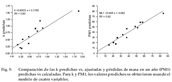 La figura 5 muestra los valores de k y PM1 predichos por los modelos de cuatro variables (k4b, PM1-4b) comparados con los mismos valores obtenidos mediante el modelo exponencial. Ambas pendientes fueron levemente inferiores a 1 con una intercepción positiva, indicando sobreestimaciones para valores bajos y subestimaciones para valores elevados. Al excluir el valor k de las hojas de Baccharis incarum, para el cual la predicción parece ser subestimada, la intercepción se trasladó a casi 0, pero la pendiente aumentó a 1.2, lo que indica una sobreestimación del modelo.