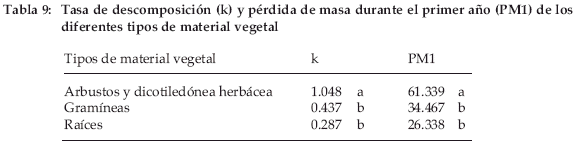 Una ANOVA de un factor mostró que las tasas de descomposición k y la pérdida de masa durante el primer año (PM1) de las hojas y tallos de arbustos y deErodium cicutarium fueron mayores que las de gramíneas y raíces (Tabla 9). A pesar de una descomposición de raíces más lenta que la de gramíneas, las diferencias no fueron significativas.