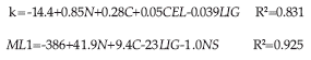 Los modelos que incluían a las mismas variables fueron generalmente mejores para PM1 que para k. Los mejores modelos con dos variables incluyeron a C y LIG/N para k y PM1. La mejora de los modelos con tres variables se debe a la adición de NS. Finalmente, se consiguió una otra mejora para estos modelos al añadir una cuarta variable: