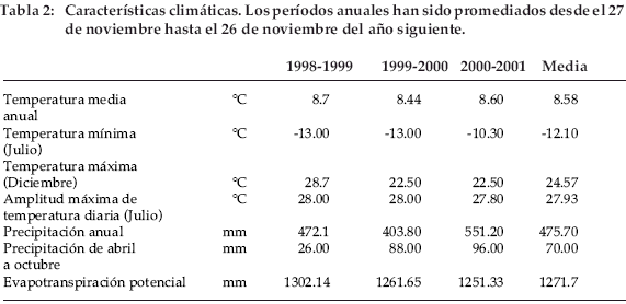 El sitio está expuesto a condiciones climáticas diurnas típicas de la montaña alta tropical. Los parámetros de temperatura de los tres años fueron muy similares (Tabla 2) con 8.6°C de temperatura anual promedio, -12.1°C de temperatura diaria mínima en julio, 24.6°C de temperatura diaria máxima en diciembre y 28°C de amplitud diaria máxima de temperatura en julio. Las precipitaciones fueron bajas, con una estación seca de abril a octubre en el primer año y de marzo a octubre en el segundo. Las precipitaciones fueron levemente más altas durante el tercer año y con una época seca menos severa. Las condiciones relativas de extrema sequía se reflejan en la elevada evapotranspiración potencial, debida a la radiación global elevada en estas elevadas altitudes.