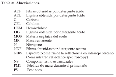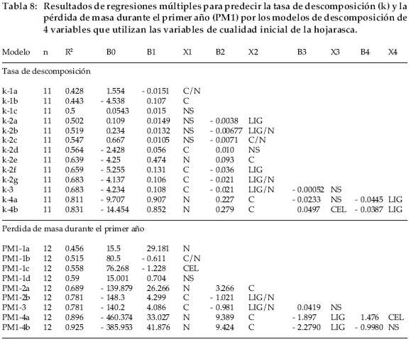 Las correlaciones con la pérdida de masa en el primer año (PM1) fueron positivas para N (P<0.05) y NS (P<0.01), y negativas para CEL (P<0.01), C/N (P<0.01) y LIG/N (P<0.05). Sin embargo, NS no es independiente de HEM y CEL, porque son los componentes dominantes expresados como proporciones de la masa total. Cuando NS es elevada HEM y CEL son bajas y viceversa. El porcentaje de LIG fue siempre bajo, y poco afectado por las variaciones de los otros componentes. En el análisis seriado de la regresión múltiple (Tabla 8), los componentes correlacionados no fueron nunca probados juntos.