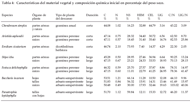 En nuestro estudio, los partes aéreas de gramíneas fueron los materiales más recalcitrantes, pese a su bajo contenido en lignina (3-9%) y su bajo cociente LIG/N (3-15). Por lo tanto, su recalcitrancia no puede ser atribuida a contenidos en lignina o N. Tal vez su baja proporción de compuestos lábiles como NS y sus consecuentes contenidos altos en HEM y CEL – que son comparativamente más recalcitrantes – pueden explicar su resistencia a la descomposición, superior a la de los otros materiales vegetales estudiados. La baja tasa de descomposición de Stipa ichu y Festuca dolichophylla puede ser atribuida a que el material vegetal fue obtenido de matas secas, que pueden haber pasado una larga etapa de senescencia. En tales condiciones, pueden haber sufrido importantes pérdidas de aminoácidos libres y carbohidratos solubles, por lixiviación (Marstop 1996). En cambio, Chondrosum simplex y Aristida asplundii fueron recolectados inmediatamente después de su senescencia. Este material vegetal queda verde muy poco tiempo y una parte se puede dispersar rápidamente con el viento, por lo que fue necesario obtenerlo lo más pronto posible después de su senescencia para poder contar con material suficiente para el experimento. Presentaron tasas de descomposición superiores a las de las dos especies previamente mencionadas de gramíneas, si bien inferiores a las de las hojas y tallos de arbustos y a las de Erodium cicutarium.