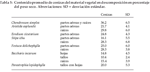 La determinación del contenido en cenizas es particularmente importante debido a la contaminación por partículas minerales. Las bolsas fijadas a la superficie del suelo sufrieron una contaminación de origen eólico, mientras que las bolsas enterradas fueron contaminadas por el suelo circundante. El contenido promedio de ceniza por material vegetal fluctuó entre 10 y 36% (Tabla 5).