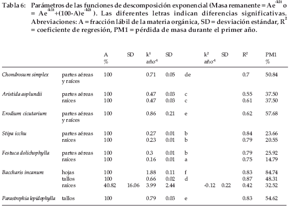Se ajustó a los datos un modelo exponencial simple, excepto para raíces de Baccharis incarum para las cuales los parámetros no convergieron (Tabla 6). Para este material se obtuvo un ajuste adecuado mediante un modelo exponencial doble. Las tasas de descomposición fluctuaron entre 0.16-1.88 por año y en el primer año la pérdida de masa fue del 15% para raíces de Festuca dolichophylla hasta 84% para hojas de Baccharis incarum. Las tasas de descomposición de las raíces fueron significativamente inferiores a las de las partes aéreas (ANOVA de un factor). Las gramíneas mostraron las tasas más bajas de descomposición. No se observó ninguna influencia de la duración del descanso.