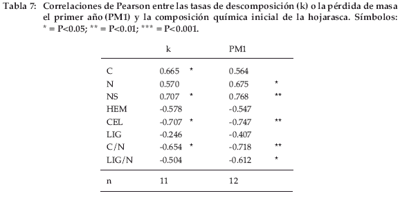 Las correlaciones entre las tasas de descomposición (k) y la composición química inicial de la hojarasca fueron positivas (P<0.05) para C y NS, mientras que fueron negativas para CEL y C/N (Tabla 7).