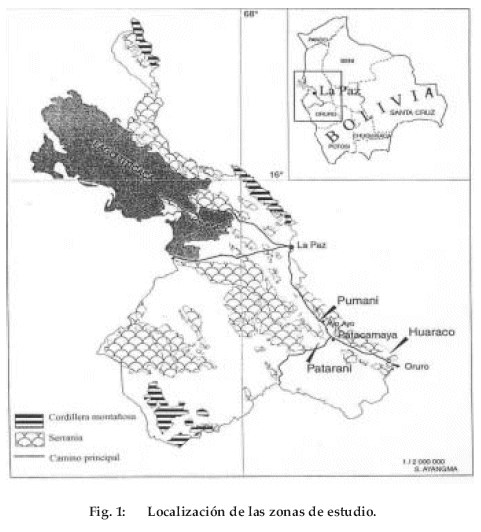 Con la finalidad de garantizar una producción de papa frente a los riesgos de helada y de variar el contenido inicial de nitrógeno del suelo, se escogieron tres sitios del Altiplano central boliviano (Fig. 1) en suelos coluviales de textura franco-arenosa muy similar (Tabla 1). Los sitios de Patacamaya (P) después de tres años de descanso y de Patarani (I) después de cinco años de descanso, quedan referenciados con la estación meteorológica de la estación experimental de Patacamaya. Huaraco (H), después de cinco años de descanso, tiene una estación meteorológica propia más al Sur, cuyos datos de temperatura mínima se corrigen para tomar en cuenta la diferencia de altura entre esta estación y la parcela.