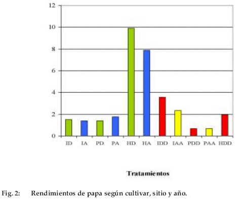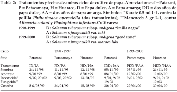 Las parcelas, una en cada sitio, son designadas por la letra P, I o H, seguida de la letra D por papa dulce o A por papa amarga el primer año (1998-1999) y repitiendo esta letra para el segundo año de cultivo (1999-2000) (Tabla 2).