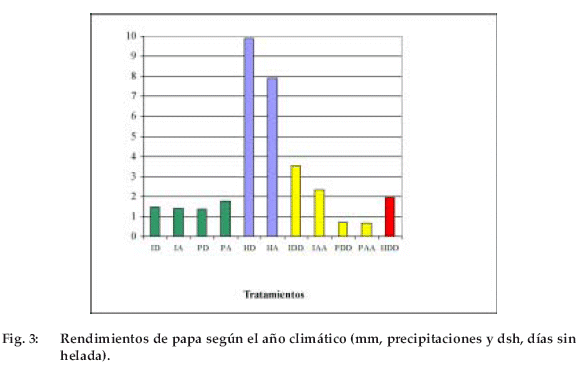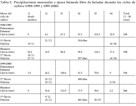 El periodo vegetativo con precipitaciones y sin heladas es más largo en 1998-1999 (en Huaraco y luego en Patacamaya-Patarani) y más corto en 1999-2000. La única parcela en pendiente es la de Huaraco (4%), donde el impacto de las heladas es reducido. En 1998-99, en Patacamaya y Patarani, luego de precipitaciones en octubre, se tuvo que esperar el mes de enero para la emergencia y el crecimiento de la papa; el periodo libre de heladas y con precipitaciones duró 114 días (Tabla 3). En Huaraco, las precipitaciones fueron mejor repartidas desde el mes de octubre y más abundantes hasta febrero, totalizando 137 días con precipitaciones y sin heladas. Este alargamiento del ciclo vegetativo contribuye al rendimiento obtenido en papa este año en Huaraco. En 1999-2000, tanto en Patacamaya y Patarani como en Huaraco, las precipitaciones fueron reducidas y la última helada llegó temprano; la época libre de heladas y con precipitaciones duró 100 días, como consecuencia los rendimientos fueron bajos.