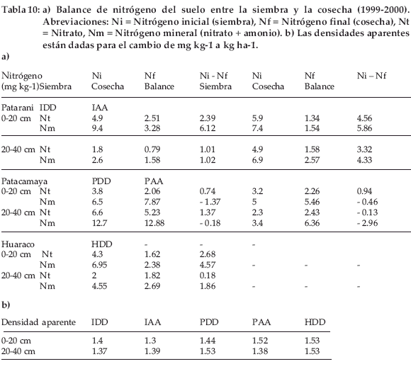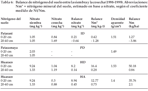 Para el nitrógeno del suelo, se estima a partir de los datos de 1999-2000 (Tabla 10 a, b) la proporción de nitrato (Nt) sobre el nitrógeno mineral (Nm) en 55.5% (promedio entre 2676%) y se aplica al contenido en nitratos del suelo en 1998-99 para evaluar el nitrógeno mineral (Tabla 7). Morales (1994) encontró en lugares semi-naturales de Huaraco un porcentaje de nitrato sobre el nitrógeno total del suelo que fluctúa alrededor de 50%, entre 20-80%, pudiendo alcanzar hasta 100% en suelo cultivado.
