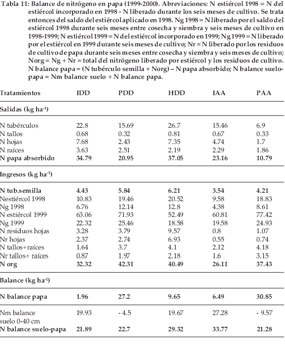 Los residuos del cultivo de papa, medidos en 1999, se distinguen por su composición en nitrógeno entre las hojas y los tallos con las raíces. Después de 12 meses de incorporar estos residuos al suelo, que incluyen seis meses del periodo inter-cultivo entre cosecha y siembra así como los seis meses del cultivo siguiente de papa ha sido liberado 72.4% del nitrógeno inicial de las hojas de papa dulce y 69.3% de la papa amarga; 53.2% de los tallos y raíces de papa dulce y 75.4% de los de papa amarga. Para el segundo año, estos porcentajes se aplican solo al saldo del nitrógeno inicial, no liberado durante el primer cultivo de papa. Las hojas se descomponen más rápidamente que los tallos y raíces (Tabla 11). Las hojas de papa amarga se mineralizan menos que las de la papa dulce y sucede lo inverso para tallos y raíces. Se sabe que la papa amarga acumula glicoalcaloides en sus tubérculos, pero no se sabe si se forman en sus hojas antes de la tuberización y si pueden tener influencia sobre una menor descomposición de estos tejidos que en la papa dulce.