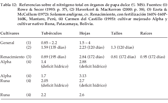 Los contenidos en nitrógeno total de los órganos de papa (Tablas 5 y 9) son muy bajos en comparación con las referencias en papa dulce, sean generales o específicas de cultivares andinos (Tabla 12). Los contenidos en nitrógeno del tubérculo y de las hojas se acercan a los valores mínimos citados en la Tabla 12, con 0.8% MS y 1.5% MS, respectivamente; el nitrógeno de las raíces es más variable y más cercano a la composición de los tallos que de las hojas.