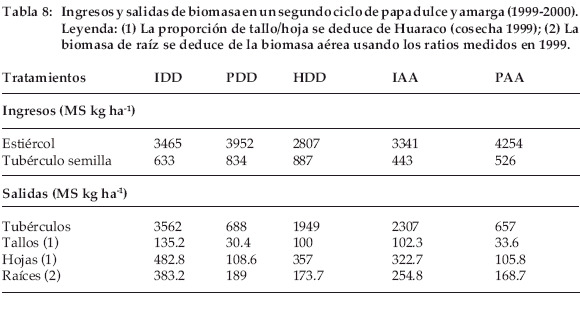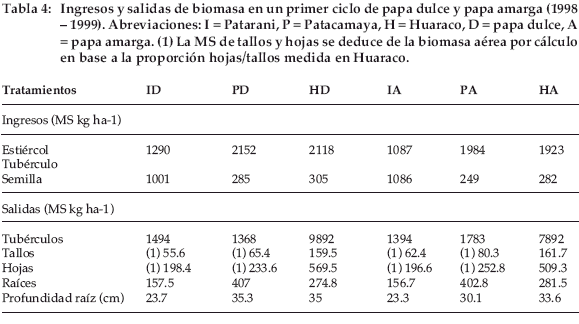El trabajo para evaluar la biomasa de raíz es muy pesado. Dizes (1992) nota en un ensayo de papa llevado a cabo en Belén, en el Altiplano norte boliviano, que el peso de raíces no sigue al peso de los tubérculos. Entonces se evaluó este peso en base a la biomasa aérea. La proporción de biomasa de raíz sobre biomasa aérea fue medida en la cosecha 1999 para cada tratamiento: 0.62 (ID), 0.61 (IA), 1.36 (PD), 1.21 (PA), 0.38 (HD), 0.42 (HA) (Tabla 4) y extrapolada en la cosecha 2000, indicando (2) en la tabla 8. En un mismo sitio, esta tasa varía muy poco entre papa dulce y amarga. Sus valores más altos en Patacamaya se deben a una biomasa radicular favorecida por una remoción del suelo más profunda con arado de discos y una producción de biomasa aérea muy baja.