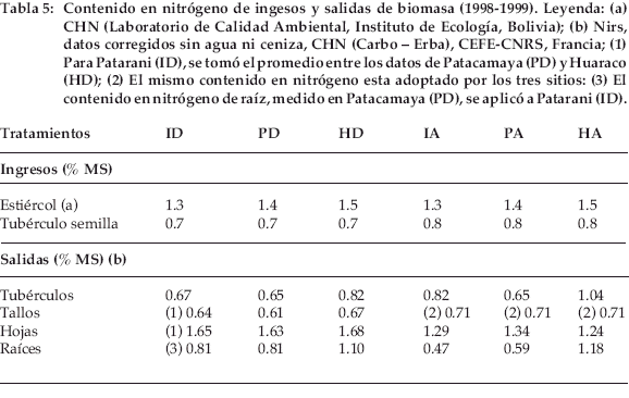 Algunos ajustes fueron necesarios para superar la falta de datos sobre biomasa fraccionada de los órganos de la papa; están señalados con una numeración entre paréntesis en el texto y en las tablas 4, 5 y 8. En 1998-99, la proporción de hojas sobre tallos en la biomasa aérea fue evaluada sobre nueve plantas en Huaraco: 3.57 para papa dulce (coeficiente de variación CV = 23%) y 3.15 para papa amarga (CV = 35%). Se utilizaron estas tasas para calcular las biomasas de hojas y tallos en función de la biomasa aérea en otros sitios y años, anotando (1) en las tablas 4 y 8.