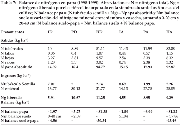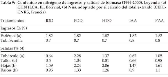 Quedan establecidas las modalidades del cálculo del balance de nitrógeno en el cultivo de papa y el peso respectivo de las biomasas, aérea y subterránea. El aporte de nitrógeno por el estiércol es significativo solo a partir del segundo año. El aporte en nitrógeno de los residuos del cultivo de papa es muy reducido. No cambiarían mucho los términos del balance si se exportan estos residuos de cultivo para la alimentación de ovinos, como suelen hacer los agricultores durante los años de déficit forrajero. El seguimiento de parcelas campesinas ha demostrado la gran variación de aportes de estiércol ovino en el cultivo de papa (hasta de 14). Las limitaciones climáticas explican en parte por qué los mayores aportes de estiércol no se traducen siempre en aumento de rendimiento. Falta también analizar el efecto de las prácticas agrícolas sobre la tasa de mineralización final del estiércol ovino en el suelo y entender con más precisión lo que ocurre durante el periodo del inter-cultivo, seco y frío.
