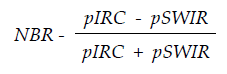 Donde, pSWIR = reflectividad del pixel i en la región del infrarrojo medio de onda corta, pIRC = reflectividad del pixel i en la región del infrarojo cercano.