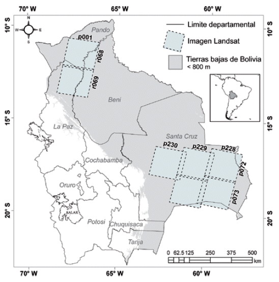 El área de estudio abarcó la totalidad del territorio de Bolivia y la validación se realizó en dos áreas piloto, la primera ubicada al norte en la Amazonía y la segunda al sur en la Chiquitanía, en un área de validación de dos y cinco escenas Landsat, respectivamente (Fig.1). Los datos evaluados incluyen áreas quemadas y referenciales de quemas.