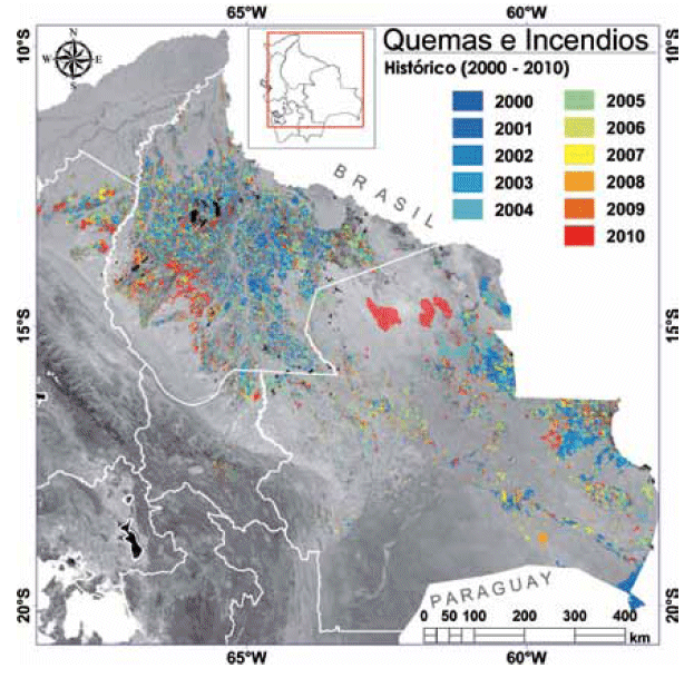 In this study we present the quantification of areas affected by fires and burns for assessing damage, the location of sites higher pressure and identify patterns of forest conversion through teledetection. To build the trajectories of historical fires in Bolivia use the product of burned areas MCD45A1 of MODIS sensor (Moderate Resolution Imaging Spectroradiometer) with a resolution of 500 m for a series of eleven years (2000-2010). The validation of this analysis was done using the normalized ratio of burning (NBR) to Landsat TM images with a resolution of 30 m, allowing classification of burned scars. We selected regions of the Amazon and Chiquitania to estimate the accuracy in detection. The monitoring of burned areas in Bolivia for the series of eleven years showed that 22,012,910 hectares were burned in total, of which 20% (4,287,512 ha) are forest fires and most of the burning surfaces are grassland and savanna, greatly surpassing the estimates before this study. Historically, fires occurred over the years 2007 and 2010, covering 3.691.815 ha surfaces and 4.343.156 ha, respectively. The overall accuracy in detection was 81%, and as to the accuracy of the magnitude of the burned areas was between 63% and 57% for the Chiquitania and the Amazon, respectively.