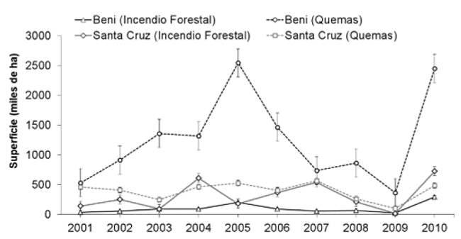 Las llanuras de sabanas del departamento de Beni son utilizadas predominantemente para la ganadería. Esta es una de las principales causas de la alta concentración de áreas quemadas en esta región, por lo que la quema de pastizales tiene su predominancia (Fig. 3) (Killeen et al. 2008). El incremento de la actividad ganadera en esta zona durante 2005 explica el incremento abrupto en áreas quemadas ese año (Fig. 3) (Fuentes et al. 2005). En general, esta tendencia refleja las malas prácticas de utilización de tierras (Pinto & Vroomans 2007, Martínez 2010).