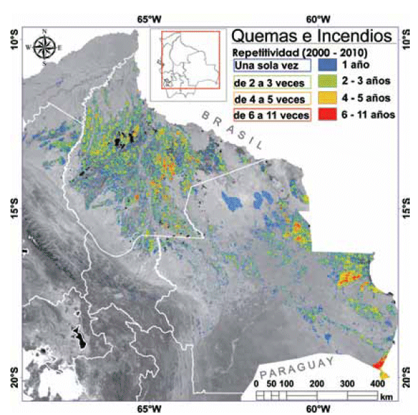 | Figura 4. | Repetitividad de quemas e incendios en Bolivia, monitoreo desde 2000 hasta 2010. |