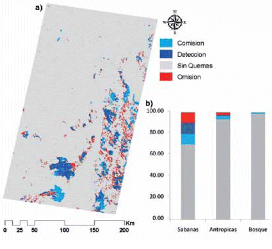 La tabulación cruzada mostró que la discriminación de cicatrices de áreas quemadas tiene errores de omisión mayores (46.1%) que de comisión (23.5%). También se observó que el 10% de las omisiones y un 9% de las comisiones se encuentran en pastos, mostrando los mayores errores en la detección. En cambio la detección de los incendios forestales mostró un error de comisión y omisión del 2% (Fig. 5).