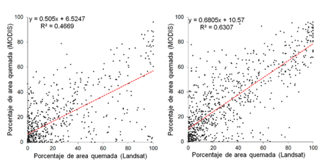 | Figura 6. | Diagrama de dispersión de cartografía de aéreas quemas de 500 m de MODIS, versus cicatrices de referencia a partir de imágenes Landsat de 30 m. Se calcula el coeficiente cuadrado de correlación lineal, R2, para la Amazonía con un nivel de exactitud de 47% y 63% para la Chiquitanía. |