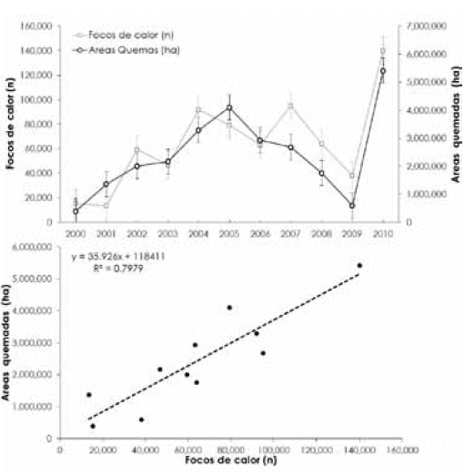 Finalmente, nuestros resultados también fueron comparados con los focos de calor, detectados por el sensor MODIS para los mismos años. A pesar de que los focos de calor (hot spots) son productos del mismo sensor, son independientes del producto MCD45A1. Ambos productos se basan en principios físicos completamente diferentes (Justice et al. 2002). La comparación se basa en encontrar la correlación existente entre ambos productos. Para este fin se compara anualmente el total de la detección de áreas de quemas y el total de focos de calor, encontrando la ecuación que describe la correlación y los valores cuadrados medios.