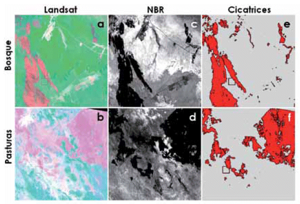 | Figura 8. | Cartografía de cicatrices de quemas e incendios en mediana resolución espacial (Landsat, 30 m). a-b. Imagen Landsat combinación 7,4,3, c-d. cociente normalizado de quemas (NBR), cicatrices de áreas quemadas en negro, e-f. cicatrices de áreas quemadas (rojo). |