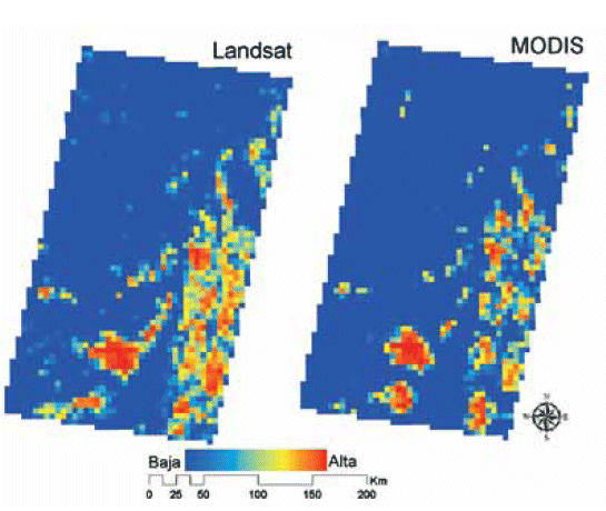 | Figura 9. | Detección del patrón espacial de las cicatrices de área quemada para NBR (Landsat) y para MCD45A1 (MODIS). En la grilla utilizada para la validación se calculó la densidad de superficie quemada por grilla (2.5 x 2.5 km) para 2010. Ejemplo de sitio piloto de validación en la Amazonía (ver Fig. 1). |