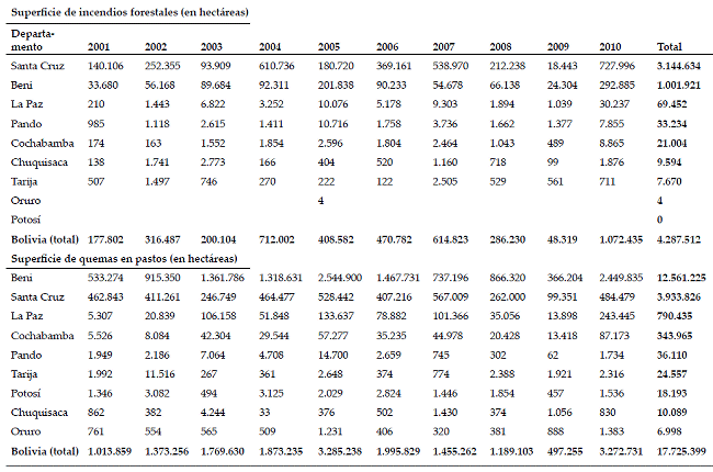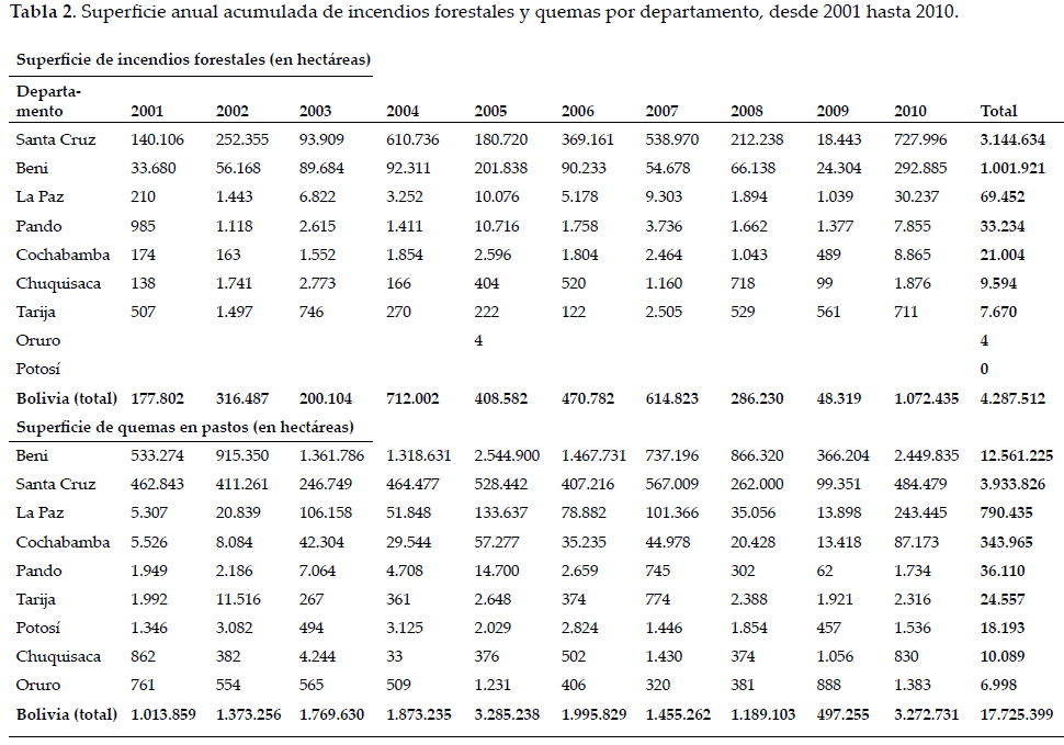 | Tabla 2. | Superficie anual acumulada de incendios forestales y quemas por departamento, desde 2001 hasta 2010. |
