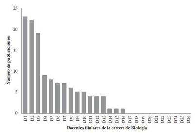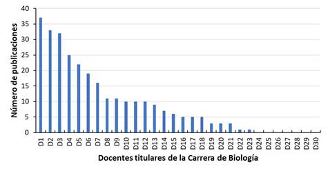 Fundada en 1830, con sus trece facultades y 55 carreras, la UMSA es una de las universidades más antiguas y la más grande de Bolivia. La importancia internacional, histórica y local de la UMSA viene siendo reconocida en diversos ámbitos, incluidos el de la ciencia. De acuerdo con los datos de Scopus®, entre 2016 y 2017 la Carrera de Biología de la UMSA repuntó con el mayor número de publicaciones científicas internacionales con revisión por pares: entre 68 y 81 publicaciones por año con el 38% y 42%, respectivamente (Achá 2018). Los docentes investigadores de planta generaron 126 artículos y el 61.5% del total ha contribuido con publicaciones internacionales, aunque diez de los docentes no aportó ninguno y son cinco quienes suman el 64% del total (Fig. 1).
