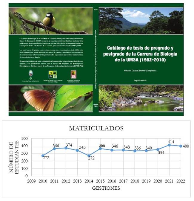 Acompañando la formación de nuevos profesionales, la Carrera de Biología instauró a lo largo de su historia varias generaciones de tutores, asesores y tribunales que consolidaron el respaldo para que jóvenes investigadores obtengan su grado académico en diversas especialidades y disciplinas de la biología. Al presente se han difundido dos ediciones sobre el resumen de las tesis de licenciatura en biología y de maestría en ecología y conservación, la última edición de 2010 cuenta con 289 registros de las tesis de pregrado y 51 registros correspondientes a las tesis de postgrado. En el período del 2010 a 2022, se incrementaron 196 tesis de pregrado, haciendo un total de 485 tesis en pregrado. En este mismo periodo se presentaron 51 tesis de postgrado, haciendo un total de 102 tesis. Entre el número de las tesis de maestría, 12 corresponden a la Maestría de Biología, defendidas entre noviembre del 2020 a diciembre del 2022.